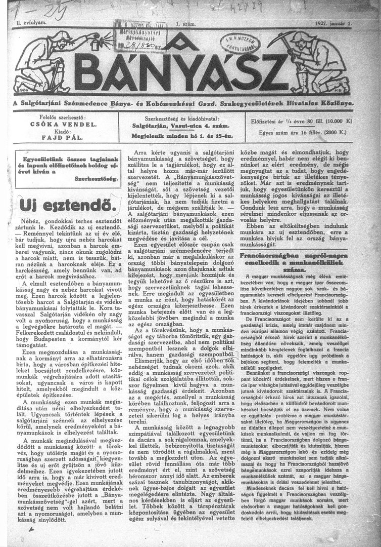A Salgótarjáni Szénmedence Bánya- és Kohómunkásai Gazdasági Szakegyesületének Hivatalos Közlönye.