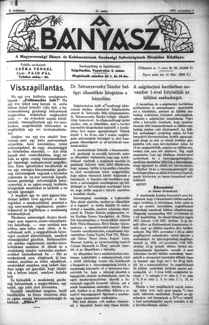 A Magyarországi Bánya- és Kohómunkások Gazdasági Szövetségének Hivatalos Közlönye.