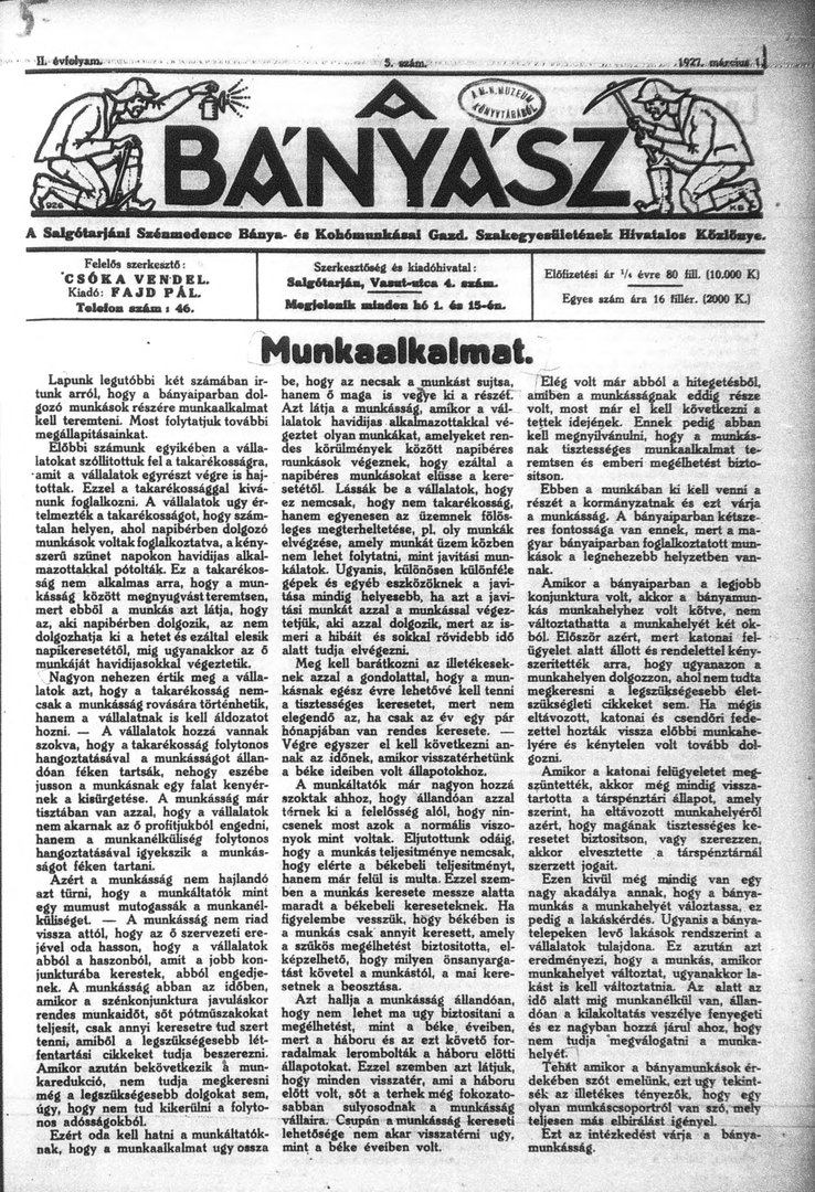 A bányász 2. évfolyam 5. szám (1927. március 1.)
