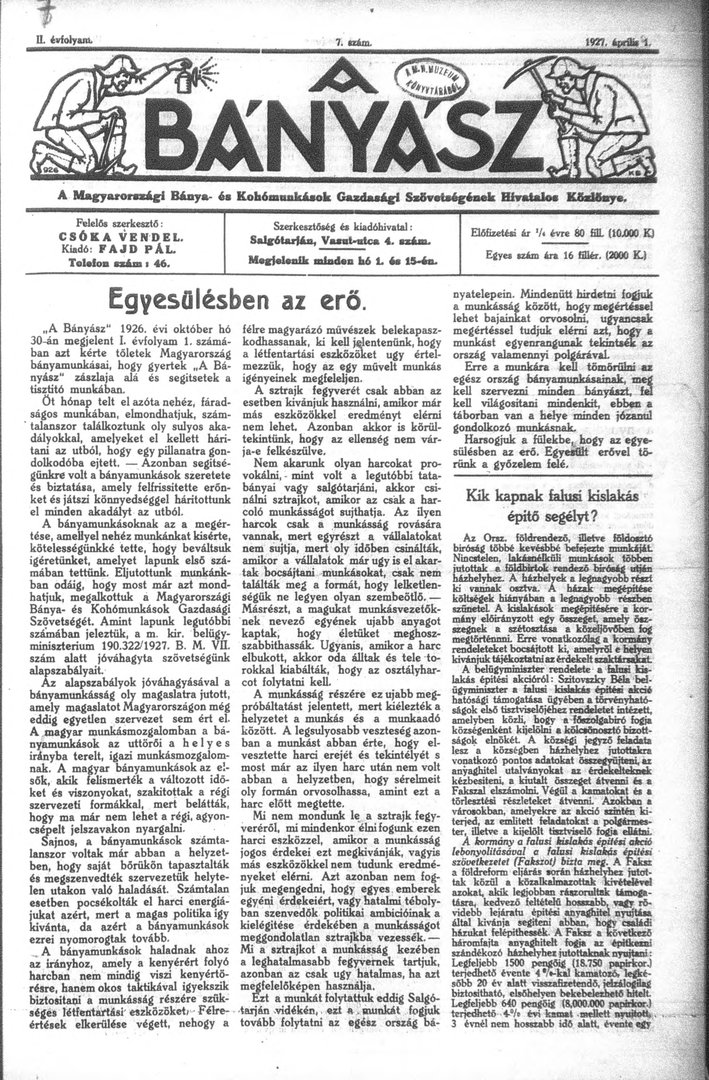 A bányász 2. évfolyam 7. szám (1927. április 1.)