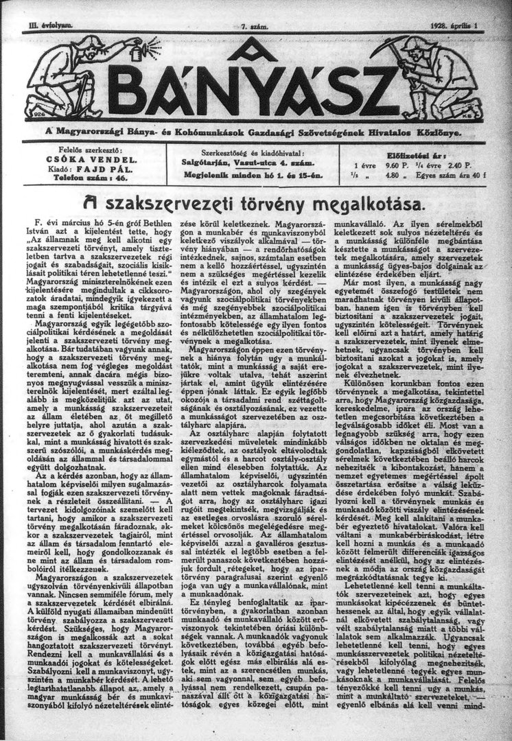 A bányász 3. évfolyam 7. szám (1928. április 1.)