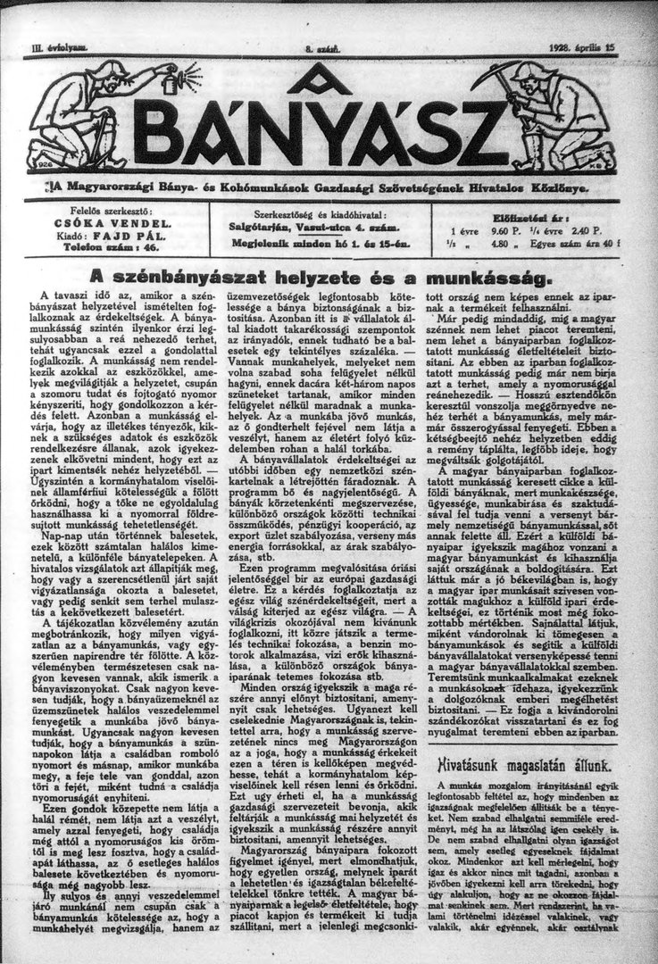 A Magyarországi Bánya- és Kohómunkások Gazdasági Szövetségének Hivatalos Közlönye.